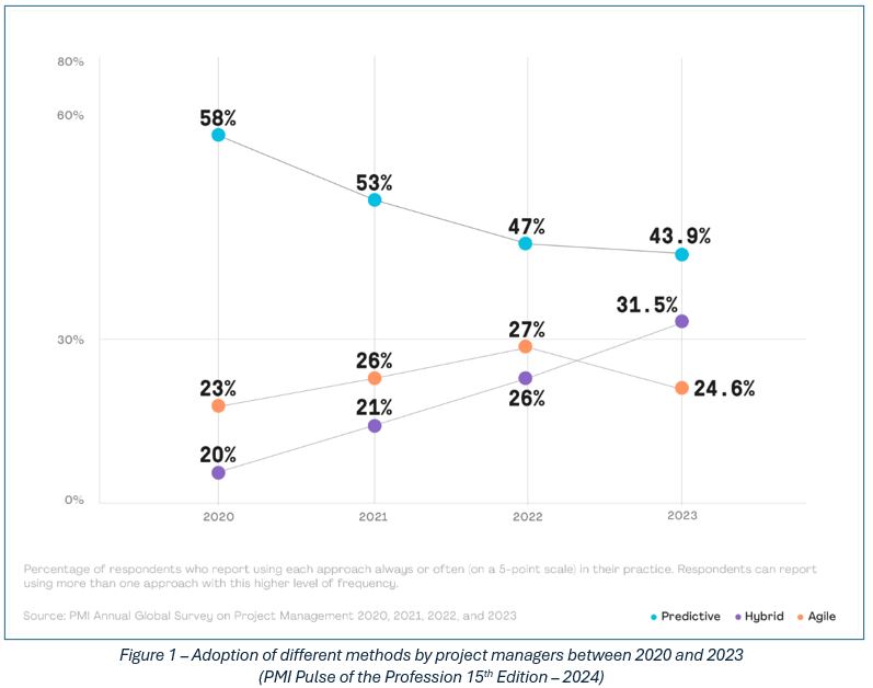 The increasing adoption of hybrid models raises an important question: Are Agile purists beginning to distance themselves from traditional Agile frameworks? The PMI’s latest Pulse of the Profession report (15th Edition, 2024) indicates a decline in Agile adoption for the first time in so many years, alongside a decrease in the decline of traditional project management methods. This trend points towards a growing preference for hybrid approaches, which blend elements of both Agile and traditional methodologies.